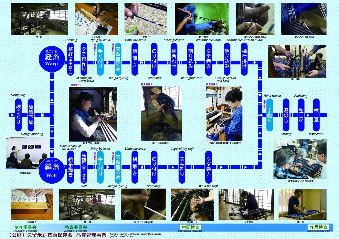 絣織物はタテ糸またはヨコ糸のみに絣糸を用いるのが一般的ですが、重要無形文化財久留米絣はタテ・ヨコ糸両方に絣を用い、タテ糸とヨコ糸の絣を合わせて織りながら柄を作る、全工程が手間と時間のかかる手仕事です。世界的にも希少な織物で、制作には緻密な計算と卓抜した技量が必要です。